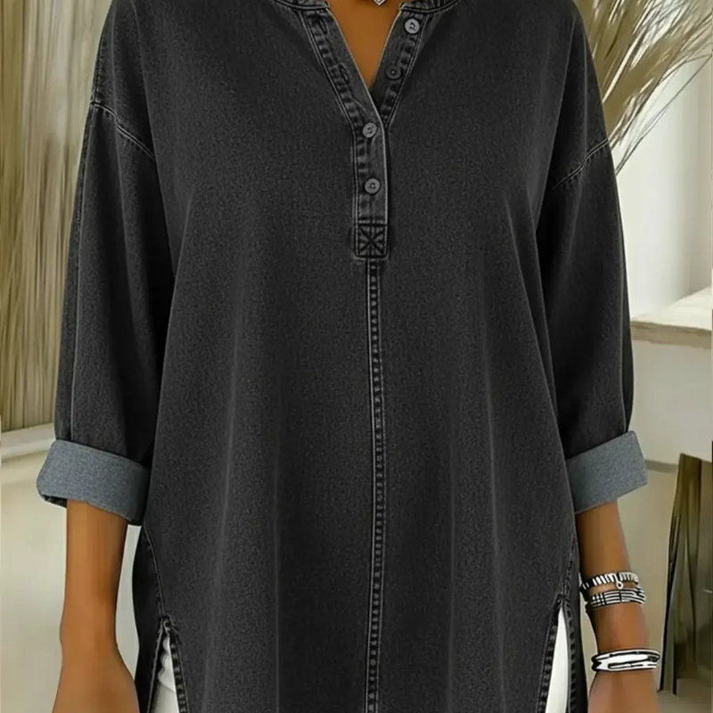 Du trenger denne tunika-topp fordi du vil kombinere komfort, bevegelsesfrihet og et moderne uttrykk i ett plagg. Den lette denimfølelsen gir deg en avslappet passform, mens V-hals og knappedetaljer gjør at du ser uformelt velkledd hele dagen.